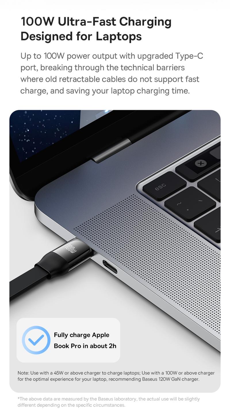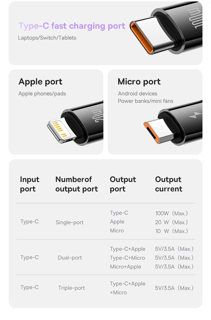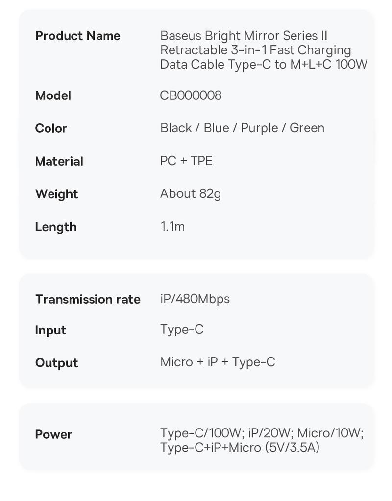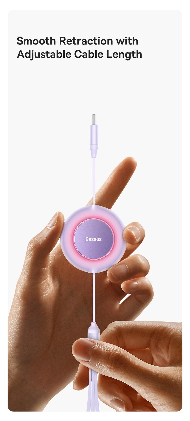 Baseus Retractable 3-In-1 Fast Charging Cable 100W Type-C to Micro USB + Lightning + USB-C