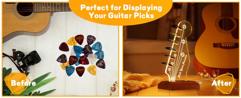 - MATERIAL: Made of premium solid wood and unique light up clear acrylic, scratch and crack resistant for top guitar pick display. Its simple design and practicality allows it to match with any decor.