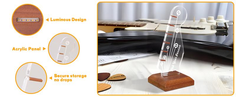 - EASY TO ASSEMBLE & USE: The guitar pick holder is easy to assemble, just insert the acrylic plate to the wooden slot, and you will get a complete luminous pick holder. It is equipped with a USB cable, so you can plug in the USB to keep it bright.